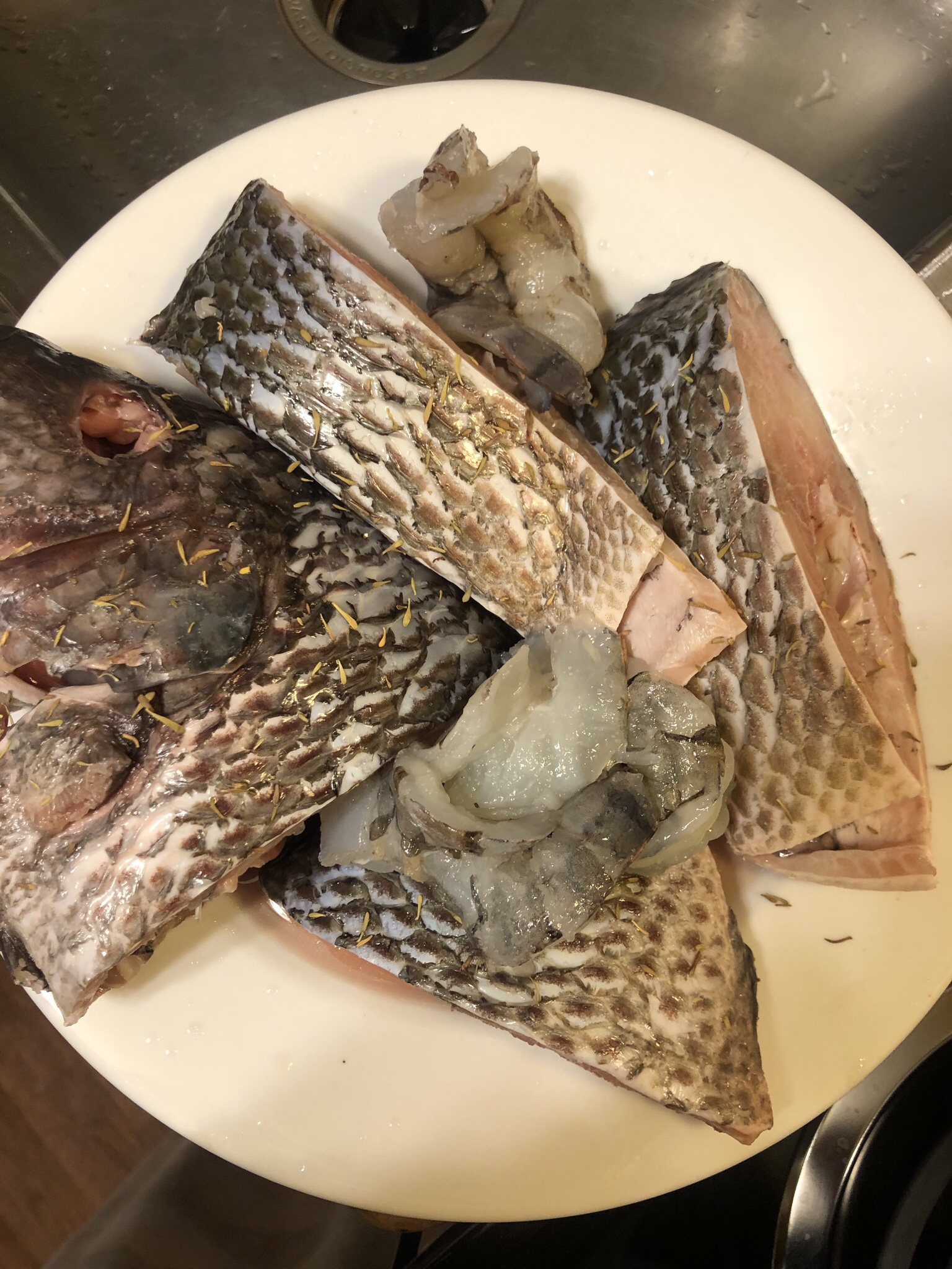 - Clean fish, season (salt, thyme, & curry), and set aside.