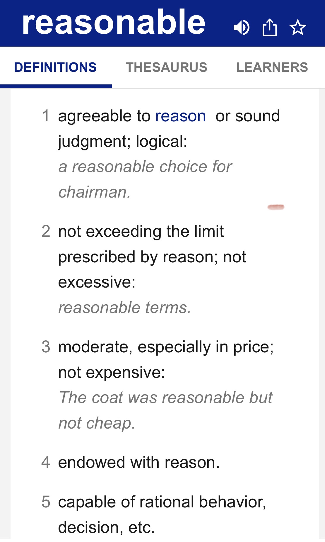 Next, according to Vocabulary.com, “If you’re reasonable, you have good sense and judgment. A reasonable decision is rational and thought out, like your mom’s reasonable rule about not eating crumbly foods in her car. When you describe a store’s prices as reasonable, you mean they’re fair — not too high. And if you are given a reasonable amount of time to do a project for school, you have no excuse for it being late.”