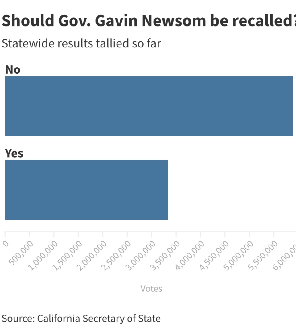 The results showed the Nos were 5.9 million, while the Yeses were 3.3 million. Larry Elder had eighty (80%) of the Yes votes.