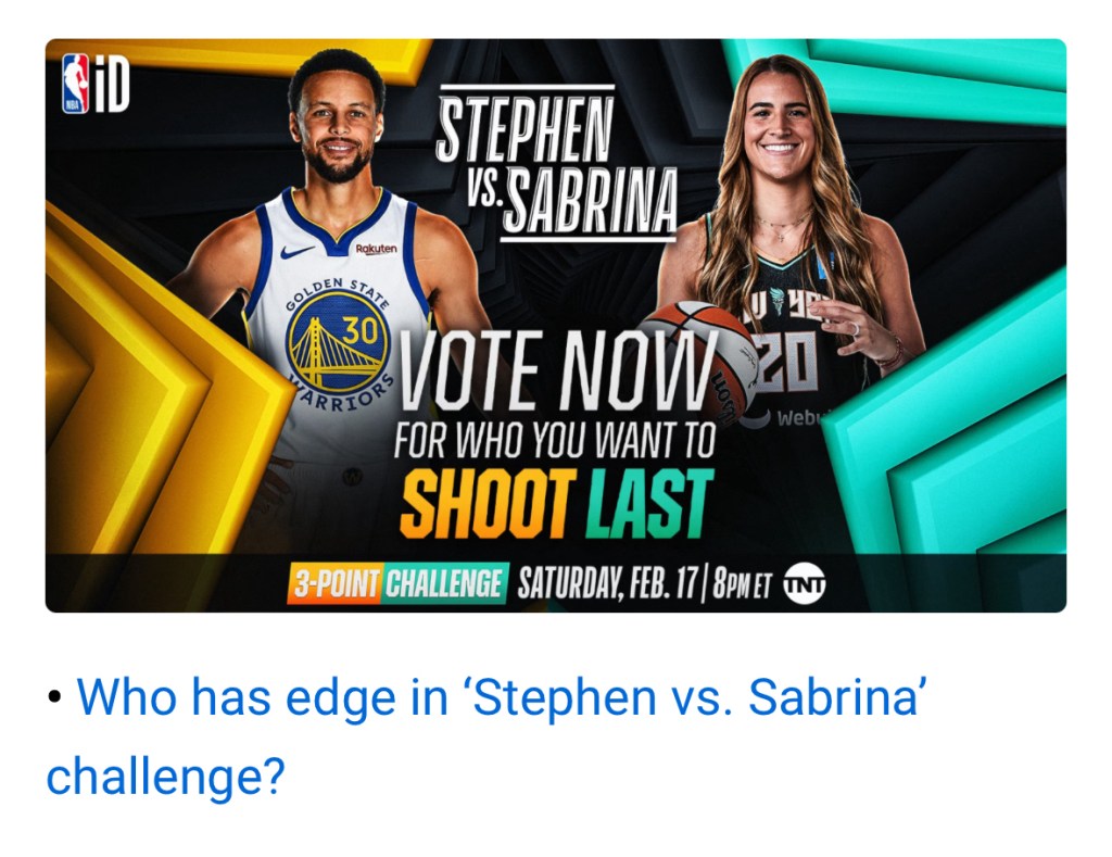I’m particularly looking forward to the first ever NBA vs. WNBA 3-Point Challenge between Golden State Warriors guard Steph Curry and New York Liberty guard Sabrina Ionescu battle it out. It’s going to be spectacularly fun watching the two highly-competitives slug it out.😊. Who do you think will win?