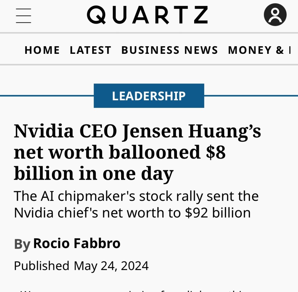 With that news, I began calculating how many stocks the CEO has. Research shows that he owns 3.4% of Nvidia. To put that in numbers, we need to know the total number of stocks that the company has. As of September 2024, Nvidia has a total of 24 trillion outstanding shares. Do the math.