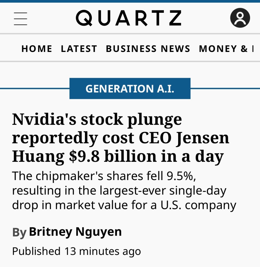 Okay. Nvidia has been in the news for several reasons. As a matter of fact, Nvidia is always in the news. The latest news, one among several, is that Nvidia CEO lost $9.8 billion in one day because the stock price plunged 9.5%! Barely three months prior, the main made similar gains when the stock price rose. And in a day, it was wiped out! The downside of investing in stocks!!