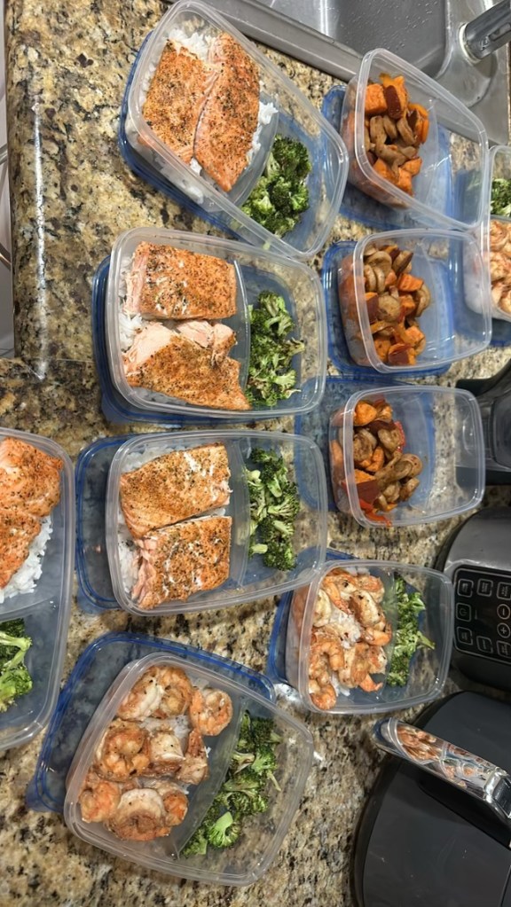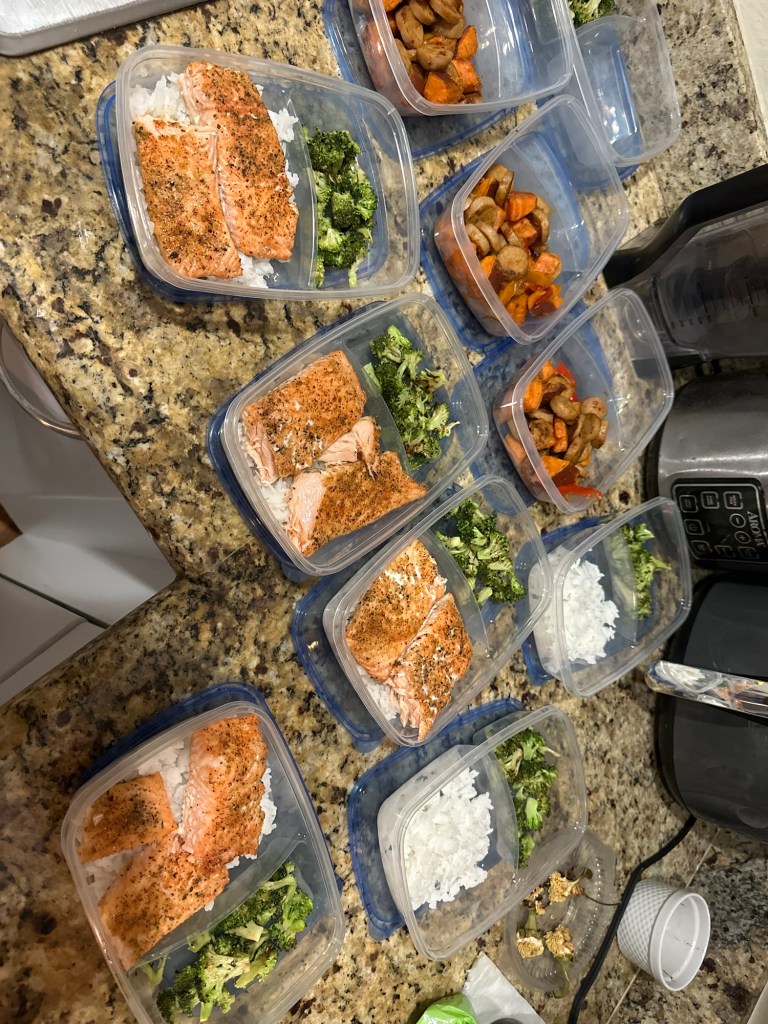 Precious2 is my younger daughter’s pet name. Her meal prep contains two choices of carb (rice and sweet potatoes), her choice of protein was salmon, she also added apple chicken sausages I believe to go with the potatoes. This time, her vegetable was broccoli. She normally has her choice of dessert/sweets – which she varies between watermelon, cantaloupe, or grapes; photo not shared.