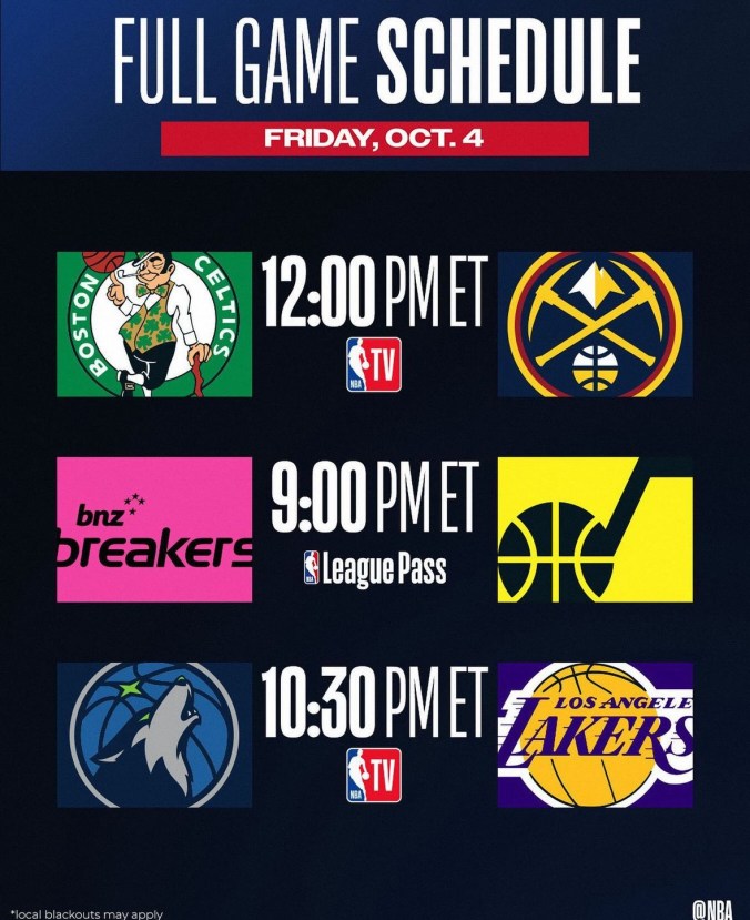 It’s the first Friday in October. There are three NBA preseason games scheduled for today in Abu Dhabi. Watch them all if you’re off work or free.
