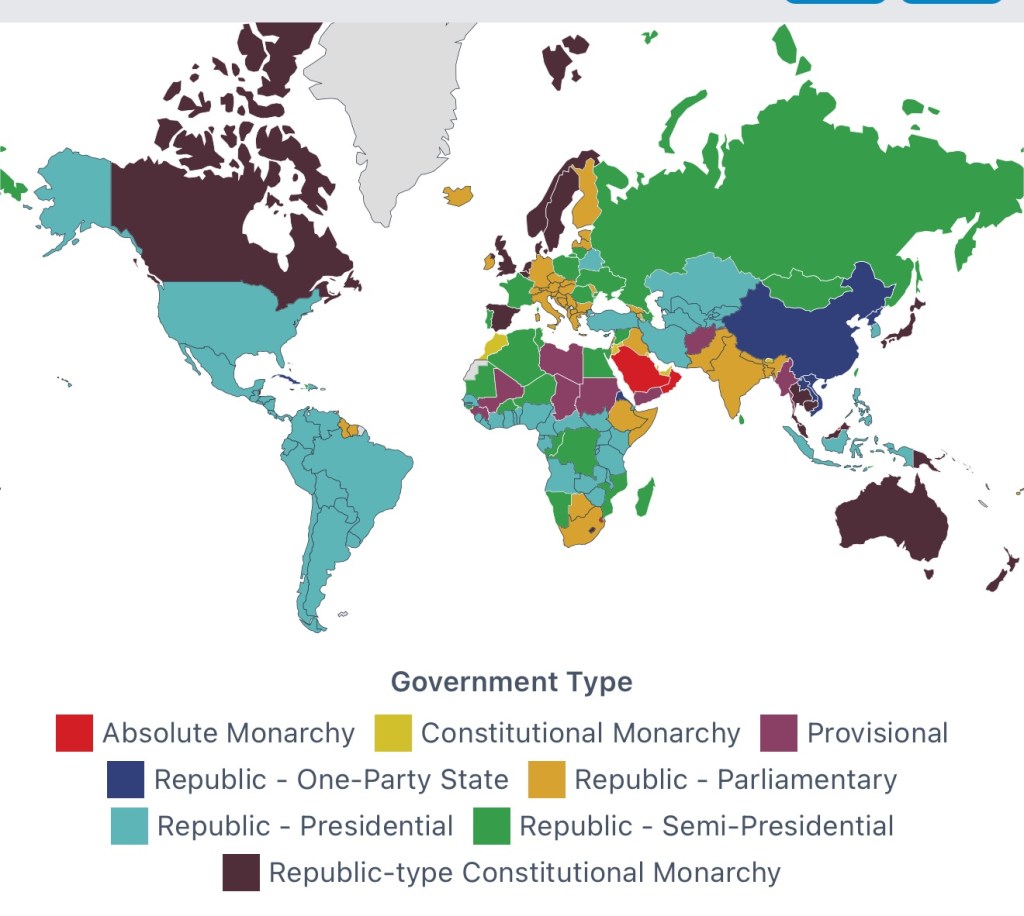 The majority of the world’s countries are republics, but they differ significantly in their implementation as there are various types of Republics as seen in the map above.
