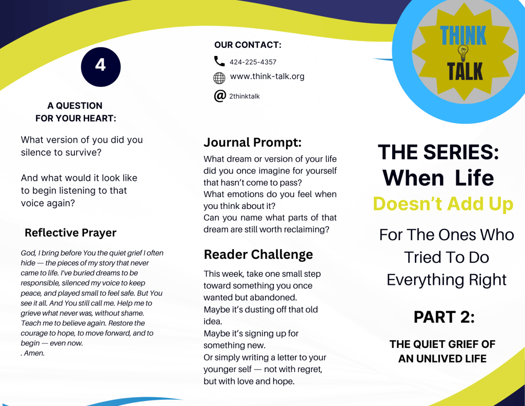 I bring before You the quiet grief I often hide — the pieces of my story that never came to life. I’ve buried dreams to be responsible, silenced my voice to keep peace, and played small to feel safe. But You see it all. And You still call me. Help me to grieve what never was, without shame. Teach me to believe again. Restore the courage to hope, to move forward, and to begin — even now. Amen.