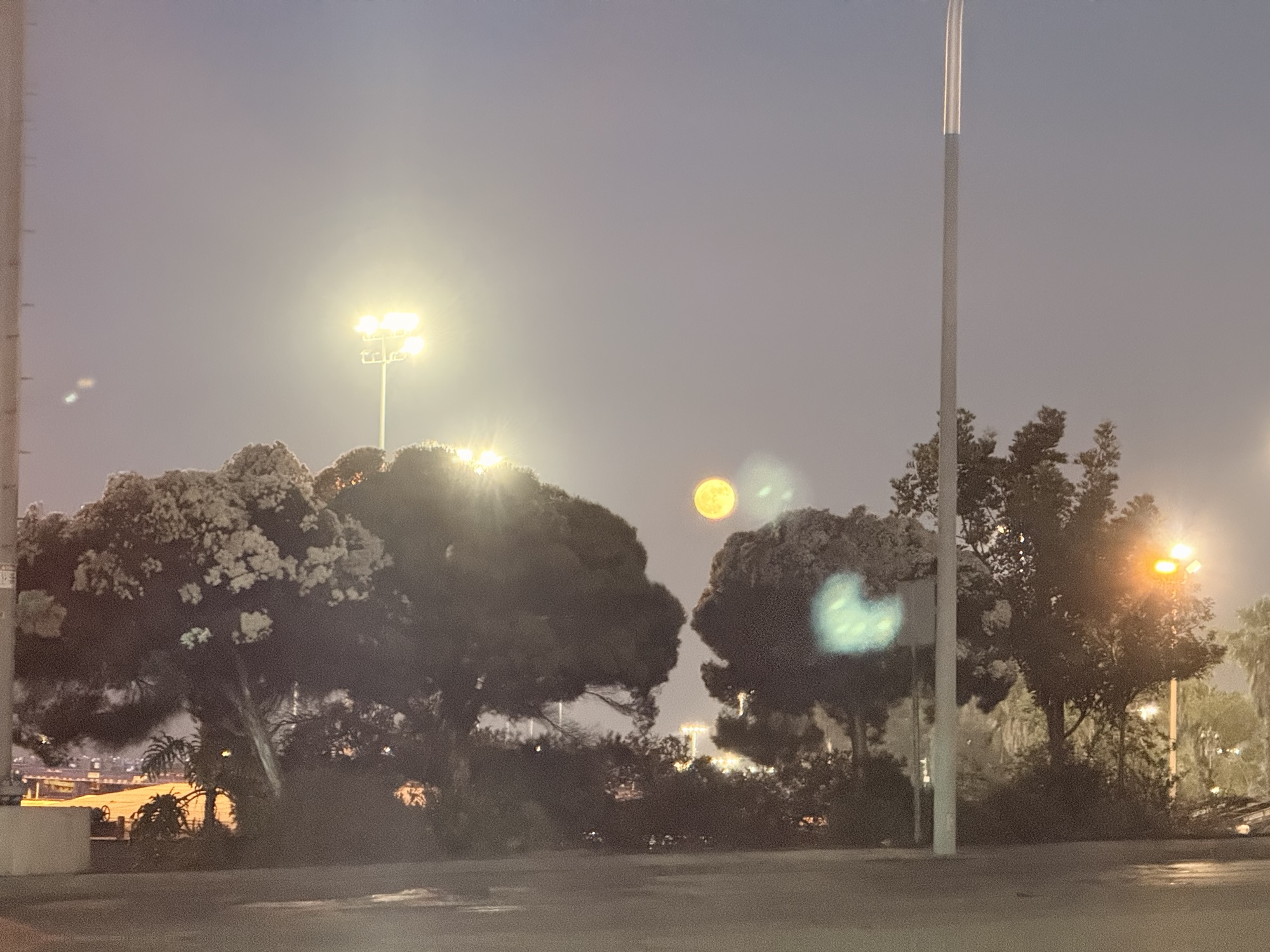 I tried to get another shot from another street – here the moon was almost hidden behind the trees.